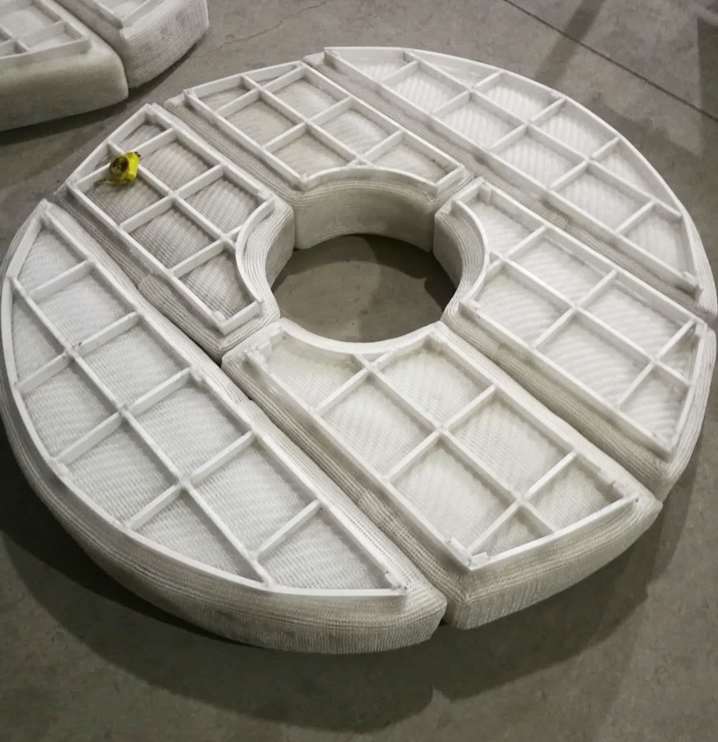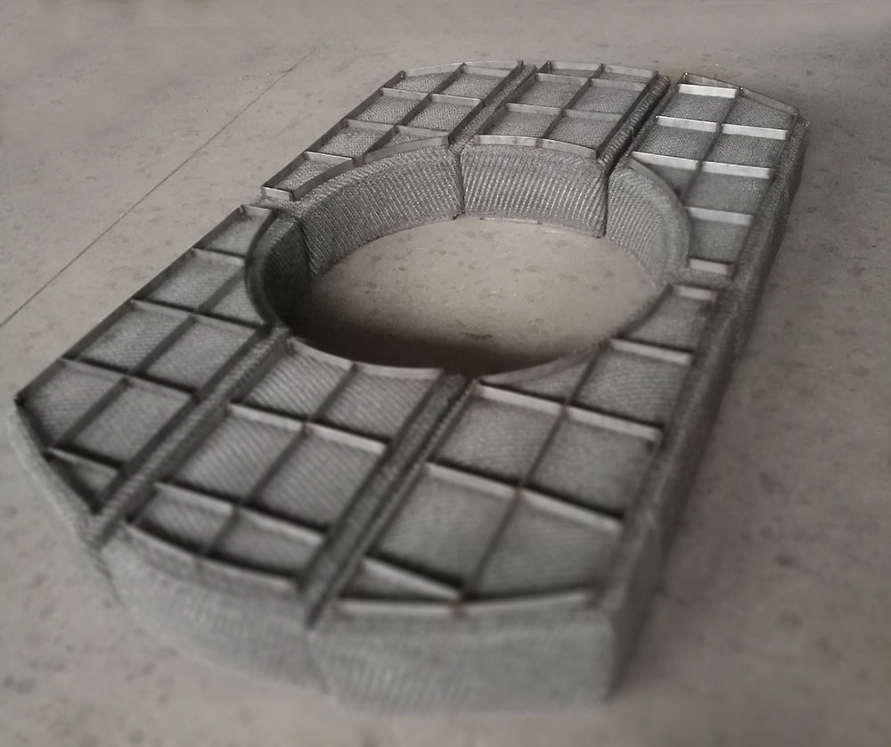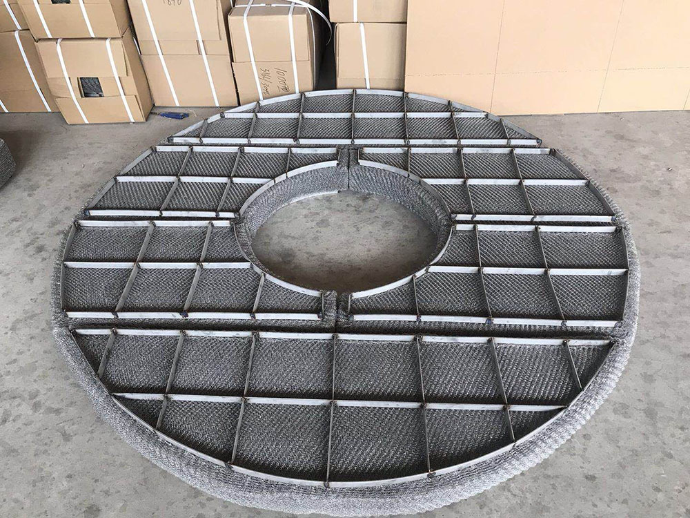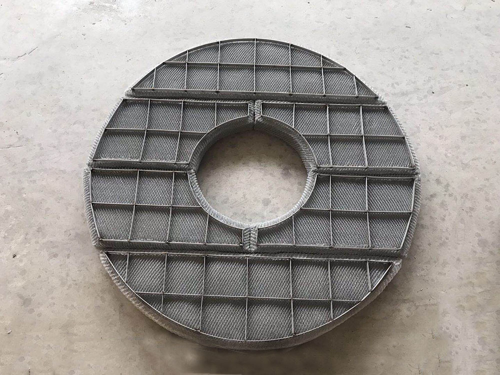 絲網(wǎng)除沫器主要是由絲網(wǎng)、絲網(wǎng)格柵組成絲網(wǎng)塊和固定絲網(wǎng)塊的支承裝置構成,絲網(wǎng)為各種材質(zhì)的氣液過濾網(wǎng),氣液過濾網(wǎng)是由金屬絲或非金屬絲組成。氣液過濾網(wǎng)的非金屬絲由多股非金屬纖維捻制而成,亦可為單股非金屬絲。該絲網(wǎng)除沫器不但能濾除懸浮于氣流中的較大液沫,而且能濾除較小和微小液沫,廣泛應用于化工、石油、塔器制造、壓力容器等行業(yè)中的氣液分離裝置中。